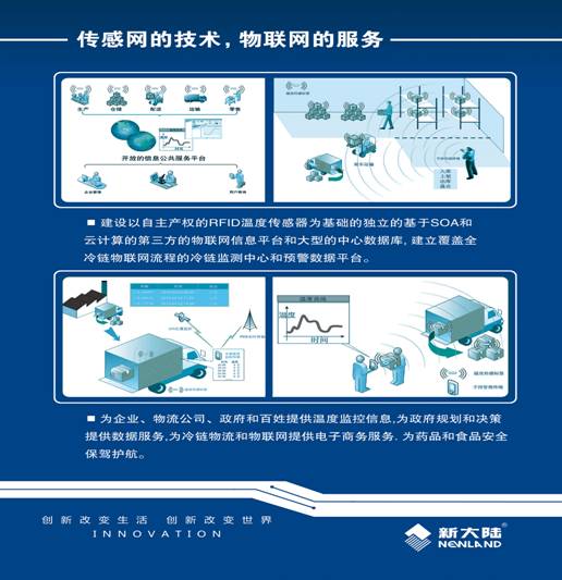 新大陸電腦股份有限公司新成立的傳感技術應用事業部憑借自身10年的RFID經驗和15年的IT經驗,結合溫度傳感網技術,針對冷鏈物流特別是冷鏈運輸過程中的溫度監控難的問題,開發了具有自主產權的基于有源RFID技術的帶有溫度傳感器的監測系統在冷鏈物流中得到重要應用,通過這種方法,可以實現對運輸/配送過程中溫度發生改變時的預警,或是對過程中的溫度變化進行實時記錄和監控,從而幫助辨識可能由溫度變化引發的質量變化及具體發生時間,并有助于質量事故的責任認定和完成食品的追蹤和追溯。