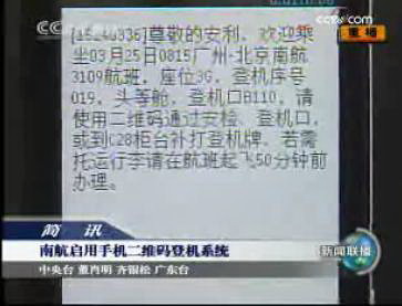 央視網消息:今天,全國第一條使用手機二維碼的航線正式在南航和廣州白云機場啟用。旅客憑著一個二維碼就可以直接到機場過安檢、登飛機。
