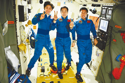 2012年6月18日,神州九號飛船與在軌運行的天宮一號目標飛行器首次載人交會對接取得成功后,航天員景海鵬、劉旺、劉洋在天宮一號實驗艙內。