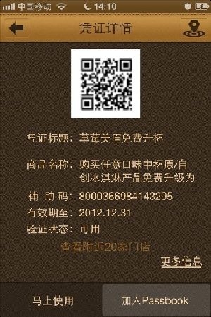 據千龍網消息,2012年10 月17日,當許多手機用戶一如既往地打開“街奴優惠”手機app使用優惠券的時候,卻發現街奴優惠的界面發生了改變,這次在界面下方有了清晰的加入Passbook的提示。